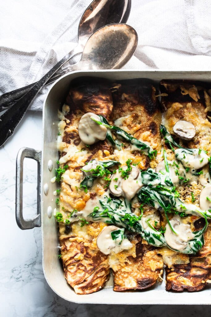De fyldte pandekager med spinat og svampefyld er skønne vegetariske madpandekager ‘på den bløde måde’, som min bedre halvdel bemærkede. Ja, det er comfort food, som det skal være.