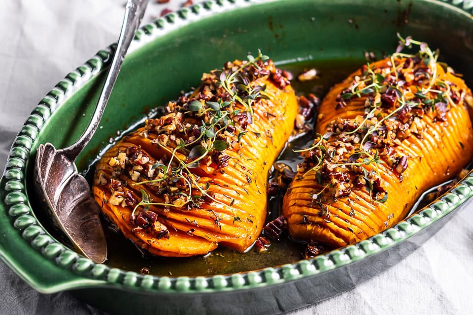 Hasselback butternut squash med timian og honning er både lækker og smuk – som tilbehør til vintermaden eller en vegetarisk hovedret.