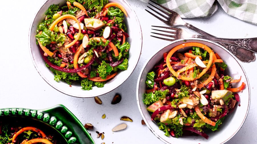Luksus råkost med rødbede, gulerod og grønkål – med quinoa, avocado og granatæble. Smuk, mættende og fuld af smag.