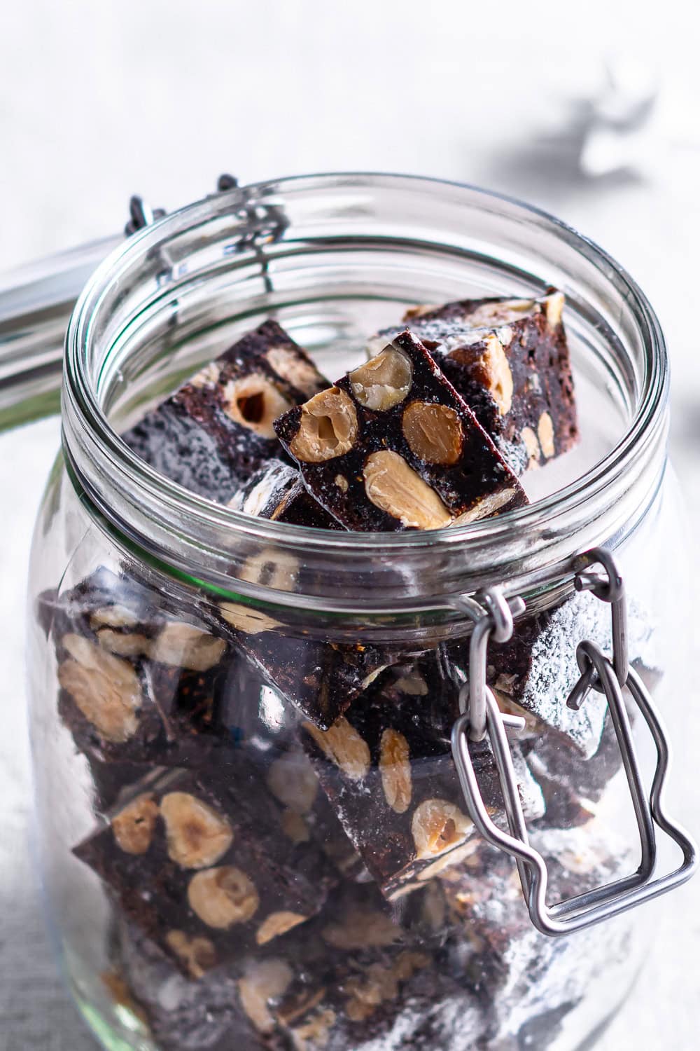 Panforte fås i et utal af udgaver, så lad mig deklarere min med det samme: Det er en mørk variant, der også har fået chokolade og masser af julens krydderier: kanel, ingefær, kardemomme, nelliker, muskatnød og sågar salt og peber! Panforte betyder ‘stærkt brød’, og det er det!